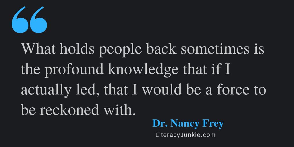 I think what holds people back sometimes is the profound knowledge that if I actually led, that I would be a force to be reckoned with, and that is something that can be scary to understand, "Oh no, I really do have a lot of power and influence." I don't mean power in terms of lording it over people, but a power that is a tremendous influence on the lives of other people. That can be intimidating because there's a huge responsibility that comes along with that influence. My advice in terms of literacy leadership is to embrace your inner leader. Know that there are a hundred different ways you can show your leadership before there is a job title or a business card that goes along with it.